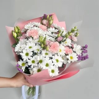 Этот букет из кустовых хризантем, лизиантусов, гвоздик и роз пронизан свежестью и жизненной энергией. Яркие цветы складываются в гармоничное сочетание, словно веер, создавая впечатление естественной красоты и единообразия.